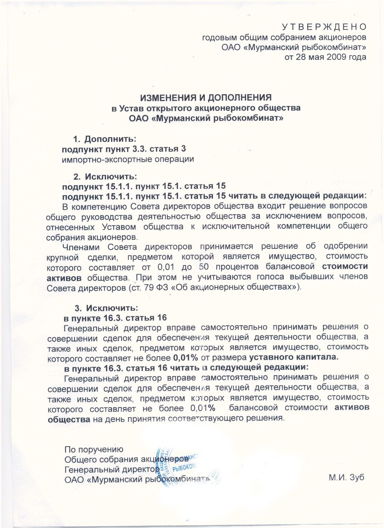 ИЗМЕНЕНИЯ В Устав открытого акционерного общества «Мурманский рыбокомбинат»